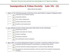 In this online interactive immigration and urban society learning exercise, students answer 10 multiple choice questions regarding late 19th century America. Students may submit their answers to be scored.