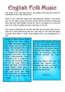 In this English folk music worksheet, students read an article pertaining to the history of folk music in England from the times of the Industrial Revolution until the 1970s.