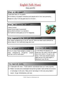 In this English folk music worksheet, 8th graders read about the characteristics, instruments, and purpose of traditional music. They read about the history of folk music and contemporary uses of this type of music. They answer 10 short...