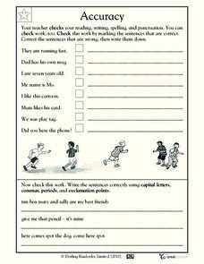 Get young writers in the practice of editing their work using this punctuation and grammar worksheet. They first read eight sentences with grammar issues, rewriting or checking off as correct. The sentence errors involve subject-verb...