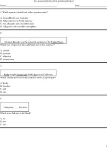 In this grammar and phonics worksheet, 1st graders complete multiple choice questions about parts of speech, fill in the blanks to sentences, spelling, punctuation, and more. Students complete 15 questions.