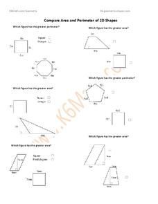 For this area and perimeter worksheet, students compare area and perimeter, determining which shapes has the greater perimeter or area. A reference web site is given for additional activities.