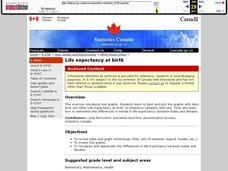 Students create a line graph on the life expectancy for males and females in Canada. In this math and health lesson plan, students review table and graph terminology, create line graphs, and analyze the differences in life expectancy...