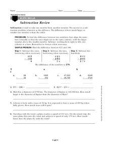 In this subtraction instructional activity, students review their subtraction skills. They find the difference of numbers in six problems.