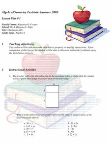 Students use a visual to introduce the Distributive Property. The lesson is chronologically numbered and follows a distinct plan. The class works with the teacher to complete the lesson. The plan is not written in a traditional way, but...