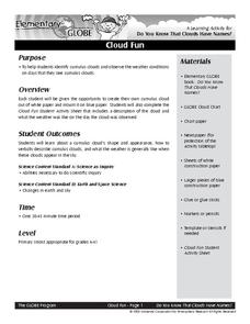Students observe cumulus clouds. In this weather lesson, students go outside to look at cumulus clouds and observe what the weather is like when they find these types of clouds. They create a cumulus cloud in an art project and complete...