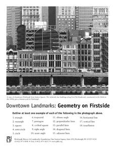 In this geometry worksheet, students outline at least one example of each of the eighteen geometry shapes and figures listed in the photograph Firstside.