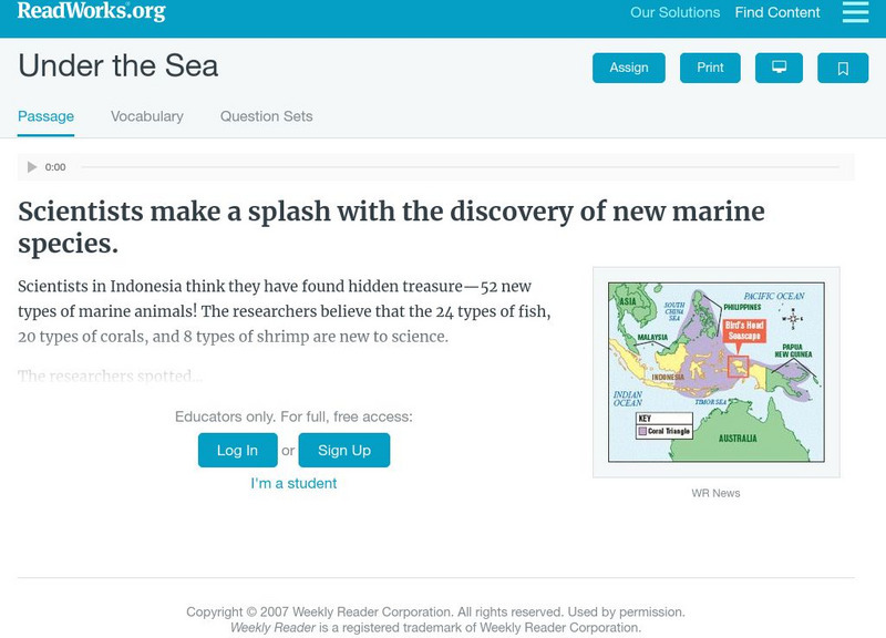 [Free Registration/Login Required] An informational text about scientists who believe they have discovered several new species of marine life off the coast of Papua, New Guinea. A question sheet is available to help students build skills...