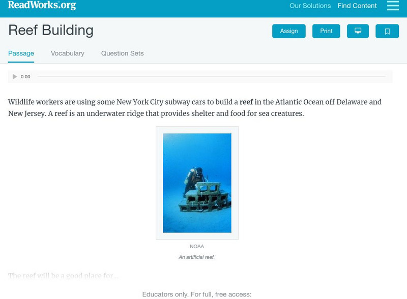 [Free Registration/Login Required] An informational text about wildlife workers who are building artificial reefs to provide food and shelter for sea life. A question sheet is available to help students build skills in reading...