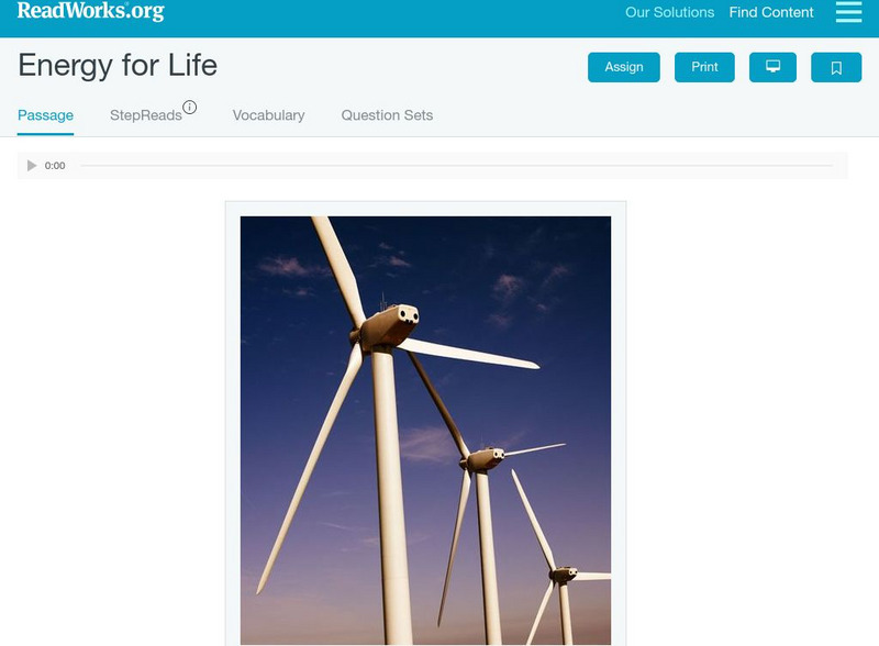 [Free Registration/Login Required] An informational text about the need for renewable, natural energy sources for the future. A question sheet is available to help students build skills in reading comprehension.