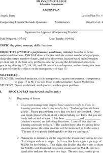Fourth graders define and identify fractions. They draw a fraction with the correct number of equal parts, shade a specified number of parts, and write a fraction based on information from a variety of story problems. Students observe...