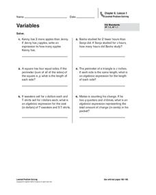 In this variables practice worksheet, students sharpen their problem solving skills as they solve 6 story problems. Students solve 6 problems.