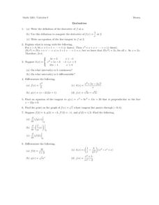 In this derivatives worksheet, students identify intervals. They differentiate given functions. This one page worksheet contains seven multi-step problems.