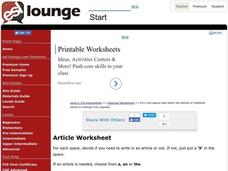 In this articles worksheet, students fill in the blanks in 14 sentences with an article a, an or the. If no article is needed, students mark the space with an X.