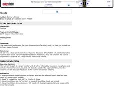 Students explore basic cloud types and the weather associated with each one. In this earth science lesson, students participate in numerous activities including going outside to observe the clouds they see, making a cloud in a...