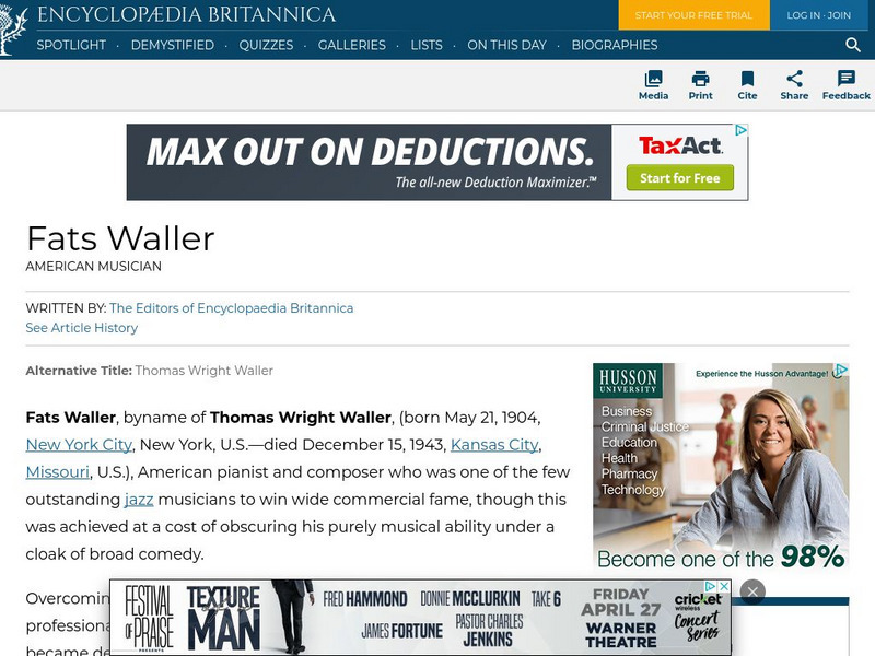 This entry from Encyclopedia Britannica features Fats Waller, an American pianist and composer who was one of the few outstanding jazz musicians to win wide commercial fame, though this was achieved at a cost of obscuring his purely...