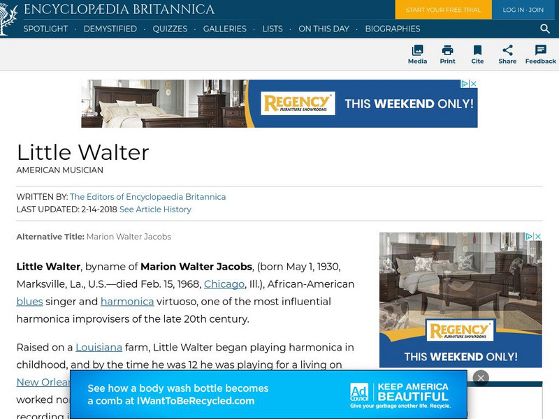 This entry from Encyclopedia Britannica features Little Walter, an African-American blues singer and harmonica virtuoso, one of the most influential harmonica improvisers of the late 20th century.