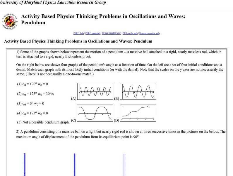 A series of thought-intensive, multichoice questions concerning pendulums and provided for by the University of Maryland. A downloadable software program on pendulums is also included.