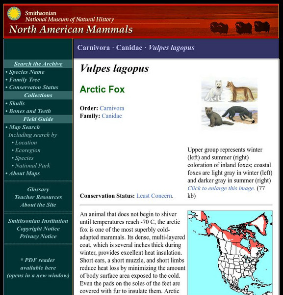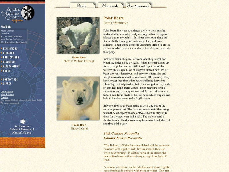 The Smithsonian National Museum of Natural History, in a section titled "North American Mammals," offers a general overview of the polar bear. Additional content includes detailed drawings, photographs, and a map showing the polar bear's...