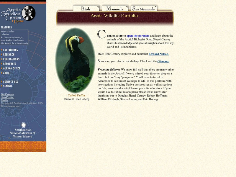 The Smithsonian Arctic Studies Center offers a portfolio of arctic animals. A page dedicated to each animal provides a physical description, personal observations of the animal in the wild, and several pictures.