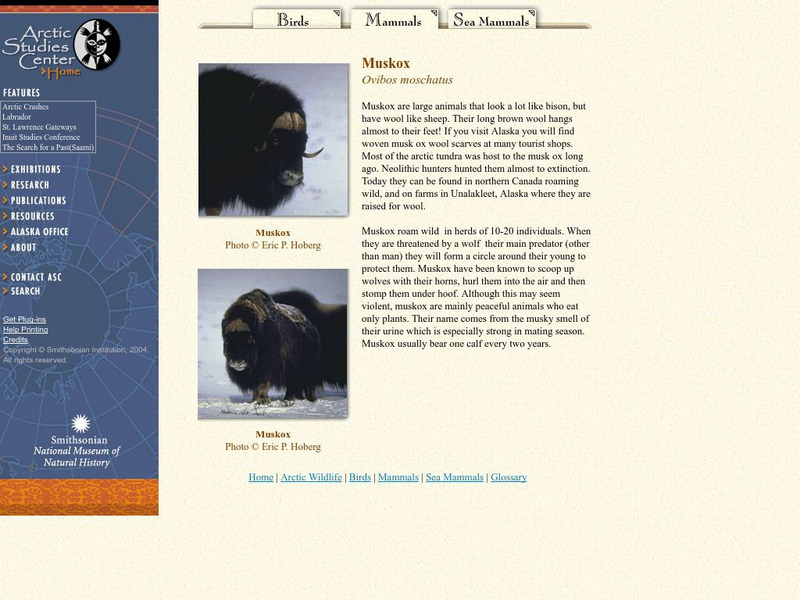 This site takes a very brief look at the muskox as an arctic creature. Several photographs are also provided.