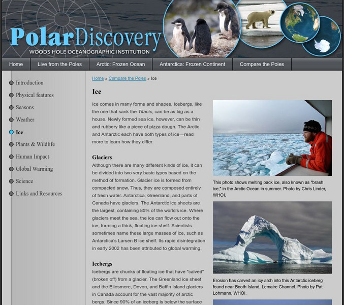 A comparison of the features of ice in the Arctic and the Antarctic. Looks at glaciers, icebergs, pack ice, and multi-year ice.