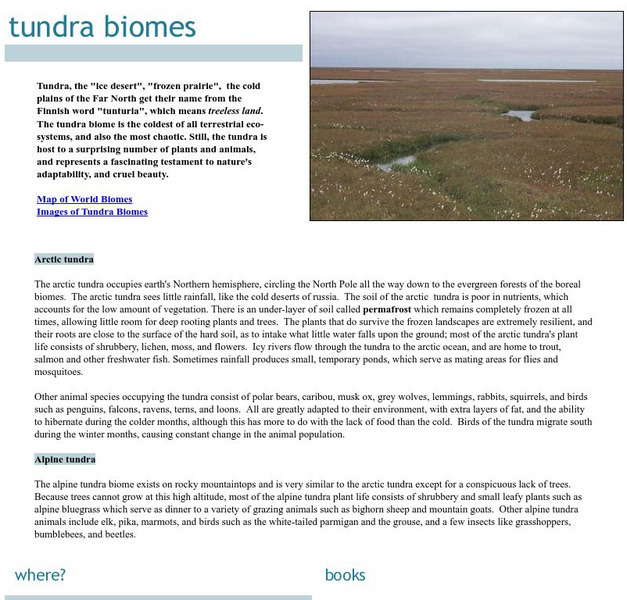 Directed toward elementary students, this site provides an overview of the tundra biome. Included are the arctic vs. alpine tundras, links to related biome web sites, world map of biomes, and photographs of the tundra biome.