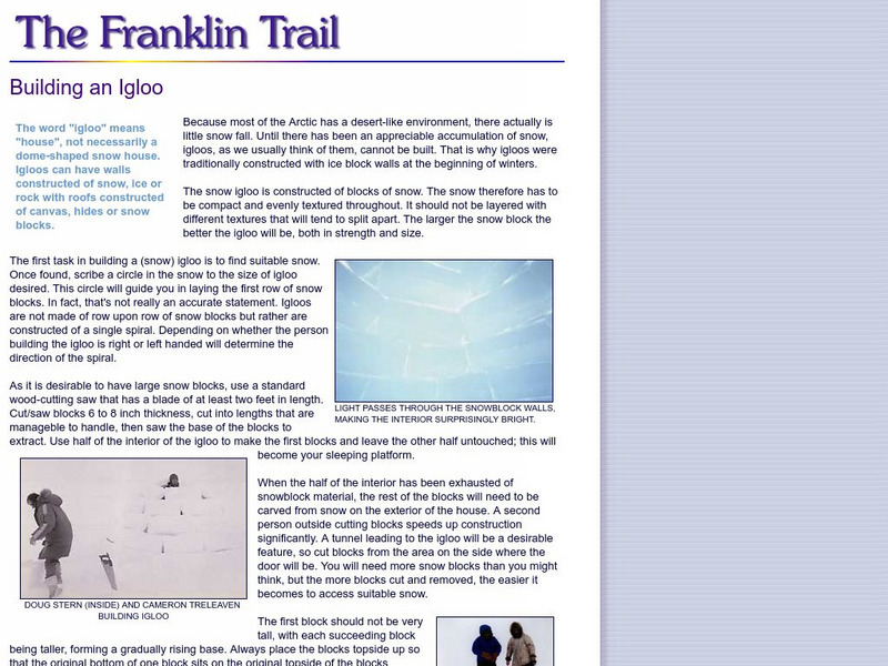 The Franklin Trail is the web site for a group of archaeologists and adventurers who made numerous trips to the Arctic to investigate what happened to the Franklin Expedition. This page of the site describes in detail how to build an igloo.