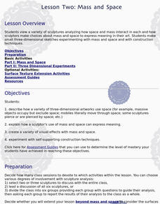 Students view a variety of sculptures analyzing how space and mass interact, and how sculptors make choices about mass and space to express meaning in their art. They make small three-dimensional sketches experimenting with mass and space.