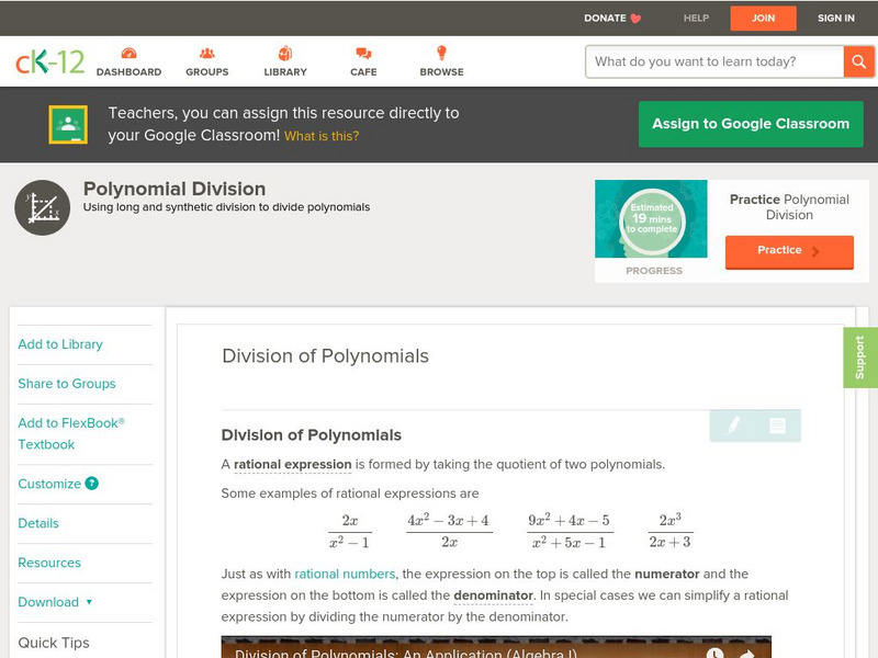 [Free Registration/Login may be required to access all resource tools.] In this lesson students will learn how to divide polynomials. Students examine guided notes, review guided practice, watch instructional videos and attempt practice...