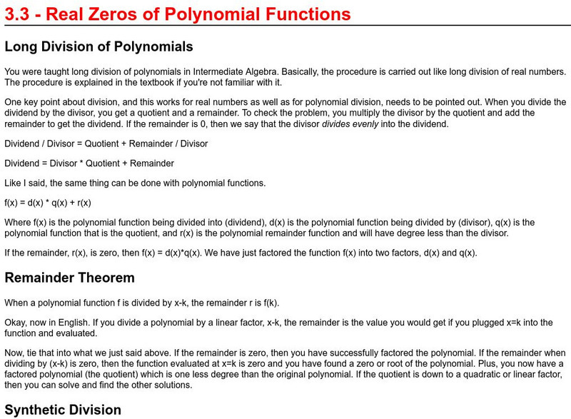 This site from the Richland Community College contains information on long and synthetic division, the remainder theorem and the factor theorem.