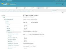 In this personal pronoun activity, students "click" on correct answers, determining the personal pronoun to fill in a blank in a sentence. Worksheet contains links to additional activities.