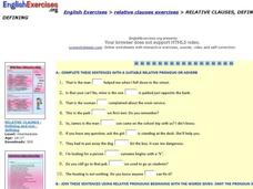 In this ESL relative clause worksheet, students complete sentences using either a relative pronouns or adverb, join sentences with relative pronouns, and determine whether relative clauses are non-defining or defining.