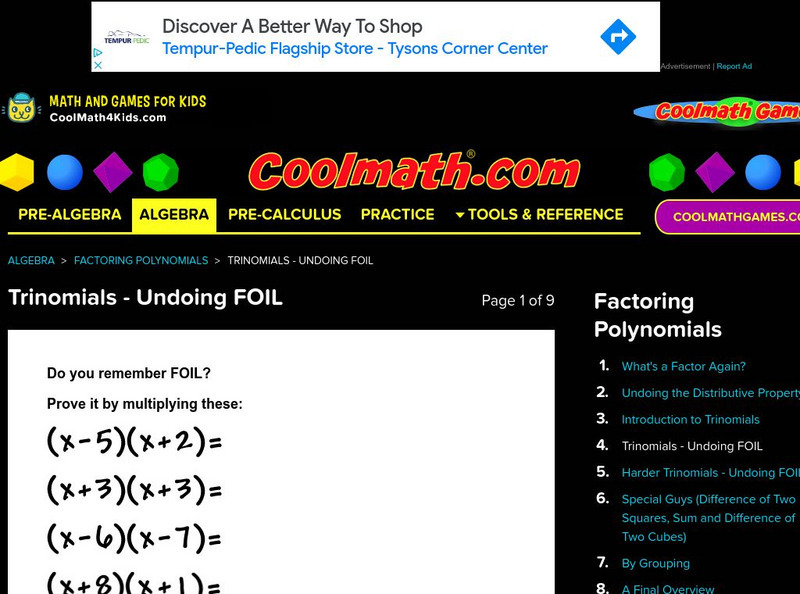 Coolmath: Factoring Polynomials Trinomials Undoing Foil
