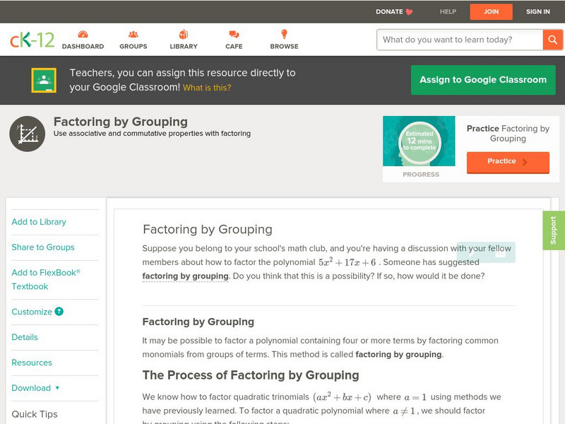 [Free Registration/Login may be required to access all resource tools.] Learn how to factor quadratic expressions by grouping.
