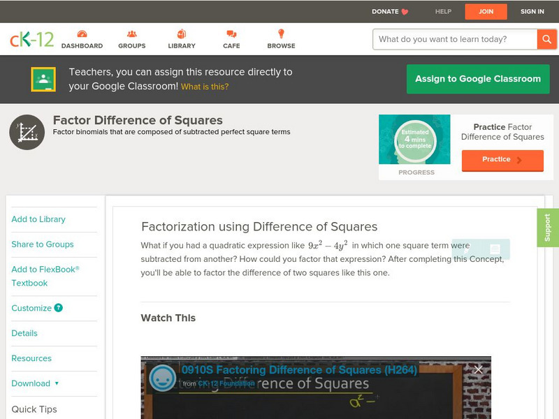 Ck 12: Algebra: Factorization Using Difference of Squares