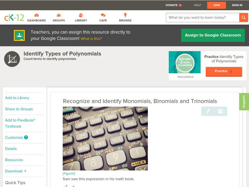 [Free Registration/Login may be required to access all resource tools.] Recognize and identify monomials, binomials and trinomials