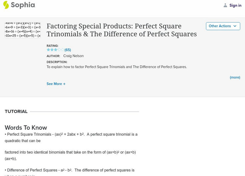 [Free Registration/Login may be required to access all resource tools.] Factor the difference of two squares and perfect square trinomials and solve quadratic polynomial equations by factoring.