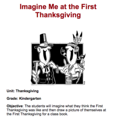 Students imagine what they think the First Thanksgiving was like and then draw a picture of themselves at the First Thanksgiving for a class book.