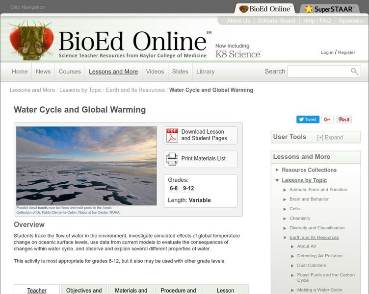 In this lesson plan, students will trace the flow of water in the environment, investigate simulated effects of global temperature change on oceanic levels, evaluate changes within the water cycle, and explain several different...