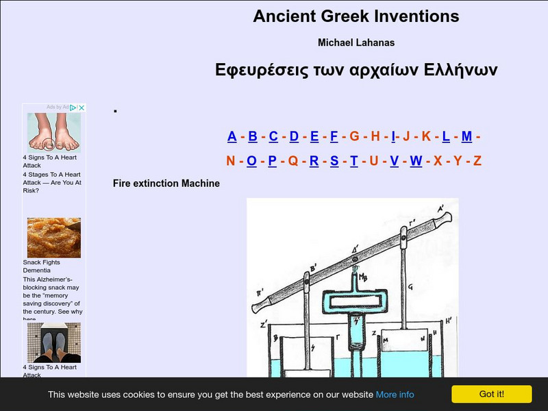 Describes a number of ancient Greek inventions (starting with 'F'), including a fire extinguisher, a flame thrower used as a weapon, a floating bridge, and experiments with flying machines.