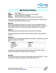 Students explore gender roles by describing an ideal partner. In this human characteristic lesson, students create a chart which describes the positive and negative aspects they seek in a partner of the opposite sex. Students demonstrate...