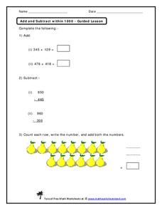 The visual nature of this worksheet makes it ideal to project for an all-class warm up. Learners first complete two horizontal addition problems involving three-digit addends. Consider whether or not you will encourage them to rewrite...
