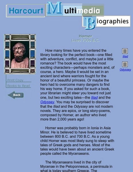 Illustrated dictionary entry over famous Greek poet Homer. Highlights his two epic poems, the 'Iliad' and the 'Odyssey', which recounts life and times of 7th and 8th century BC. Traces Homer's lineage and how his works impacted the Greek...