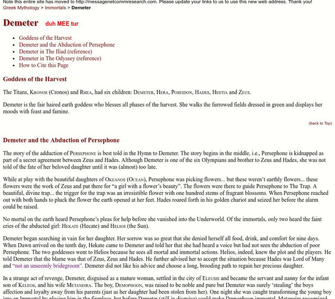 This detailed retelling of the myth of Demeter and of her daughter, Persephone. The resource contents concludes with citations from the Iliad and the Odyssey.