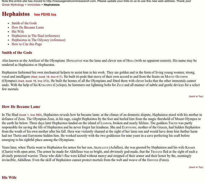 The Olympians depended on Hermes (Roman name "Mercury") to bring them all sorts of news. Learn about his role at this site, which includes a listing of all the times Hermes is mentioned in the Iliad and the Odyssey.