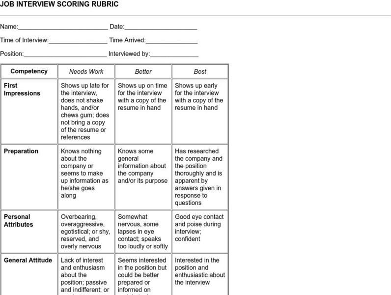 This site presents a scoring rubric for job interviews. Topics included are First Impressions, presentation, personal attributes, general attitude, personal appearance and responses.