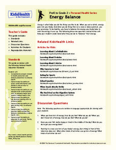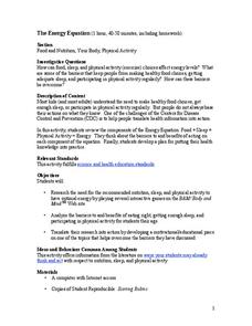 Students explore energy. In this health and nutrition lesson, students brainstorm a list of healthy foods that provide energy, and identify physical activities that burn energy. Students complete a good nutrition worksheet.