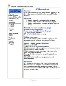 Students explore geography by participating in a treasure hunt activity. In this Global Positioning System lesson, students define the terms latitude and longitude while utilizing an electronic GPS device. Students view a PowerPoint...