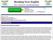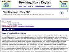 In this English instructional activity, students read " Airports Ban Liquids on Planes," and then respond to 47 fill in the blank, 7 short answer, 20 matching, and 8 true or false questions about the selection.